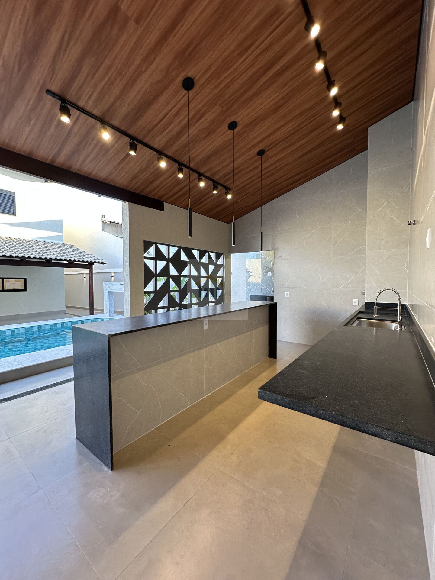 Varanda gourmet com churrasqueira, balcão ilha e iluminação moderna
